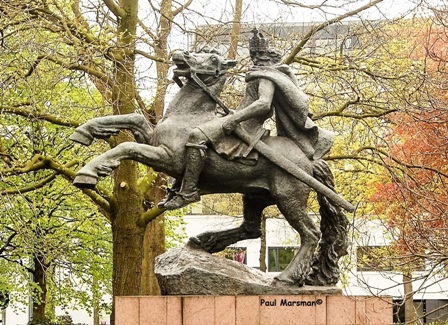 Op de foto een standbeeld van Karel de Grote in het midden van het naar hem vernoemde "Keizer Karelplein."