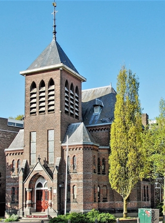Interessant voorbeeld van een kleinschalig neo-gotisch kerkelijk complex.